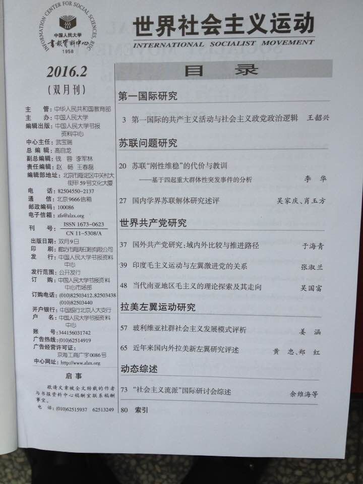 我部李华教授在黑龙江省社会科学院主办《西伯利亚研究》2015年第5期发表的《苏联刚性维稳的代价与教训——基于四起重大群体性突发事件的分析》一文(10000字),被中国人民大学《世界社会主义运动》(国家一级期刊)2016年第2期全文复印转载。
