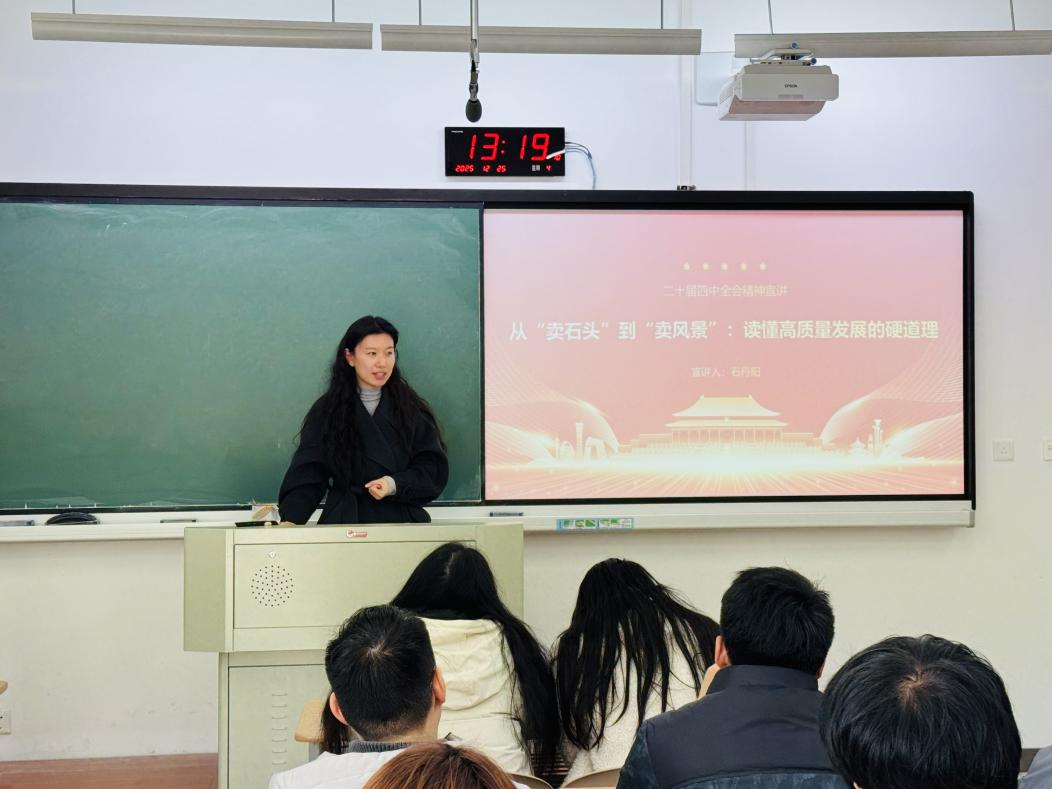 在学校宣讲团专题宣讲环节,青年宣讲员立足自身专业与实践,用鲜活语言和生动案例解读全会精神。